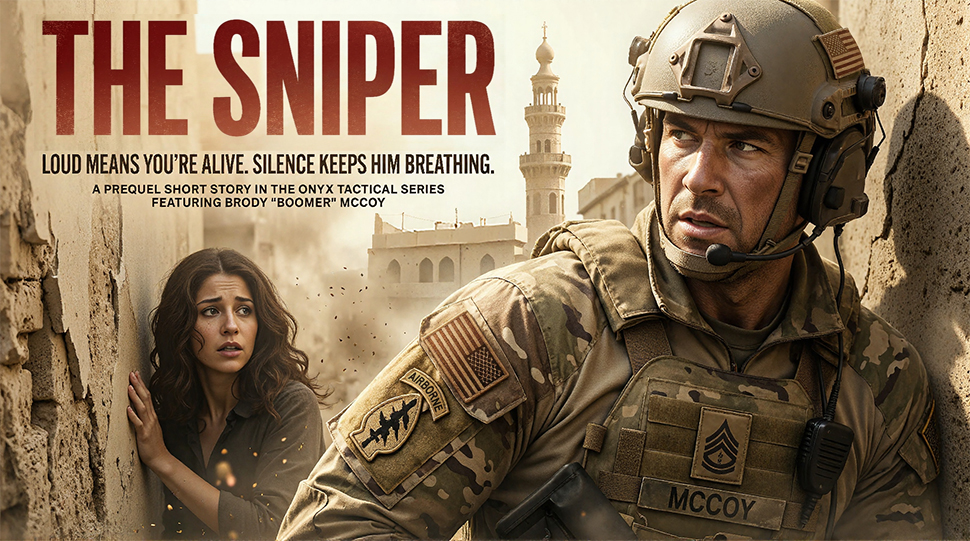 “The Sniper” is a high-octane prequel short story in the Onyx Tactical series. It features the team’s beloved explosives expert, Brody McCoy, in a race against time, gravity, and a 7.62mm round.